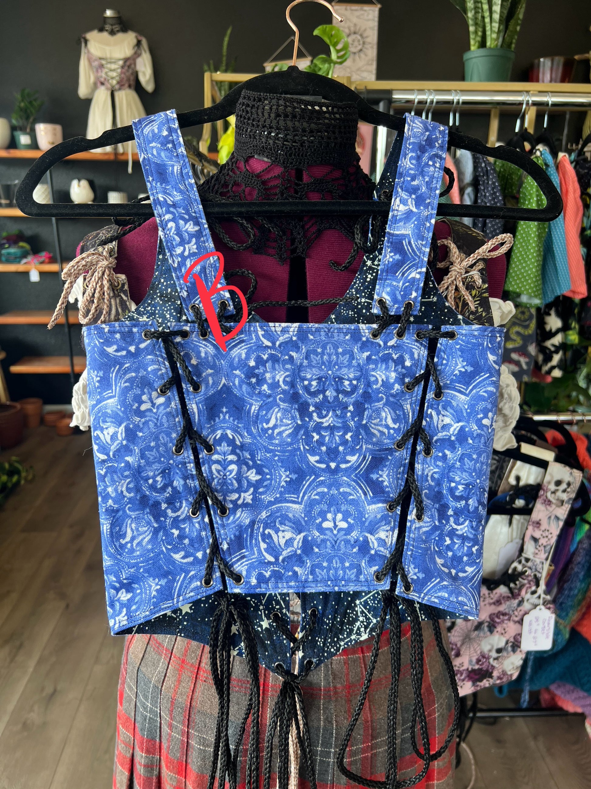 Each corset is reversible with a fantasy print on one side and a more rounded print on the other side.