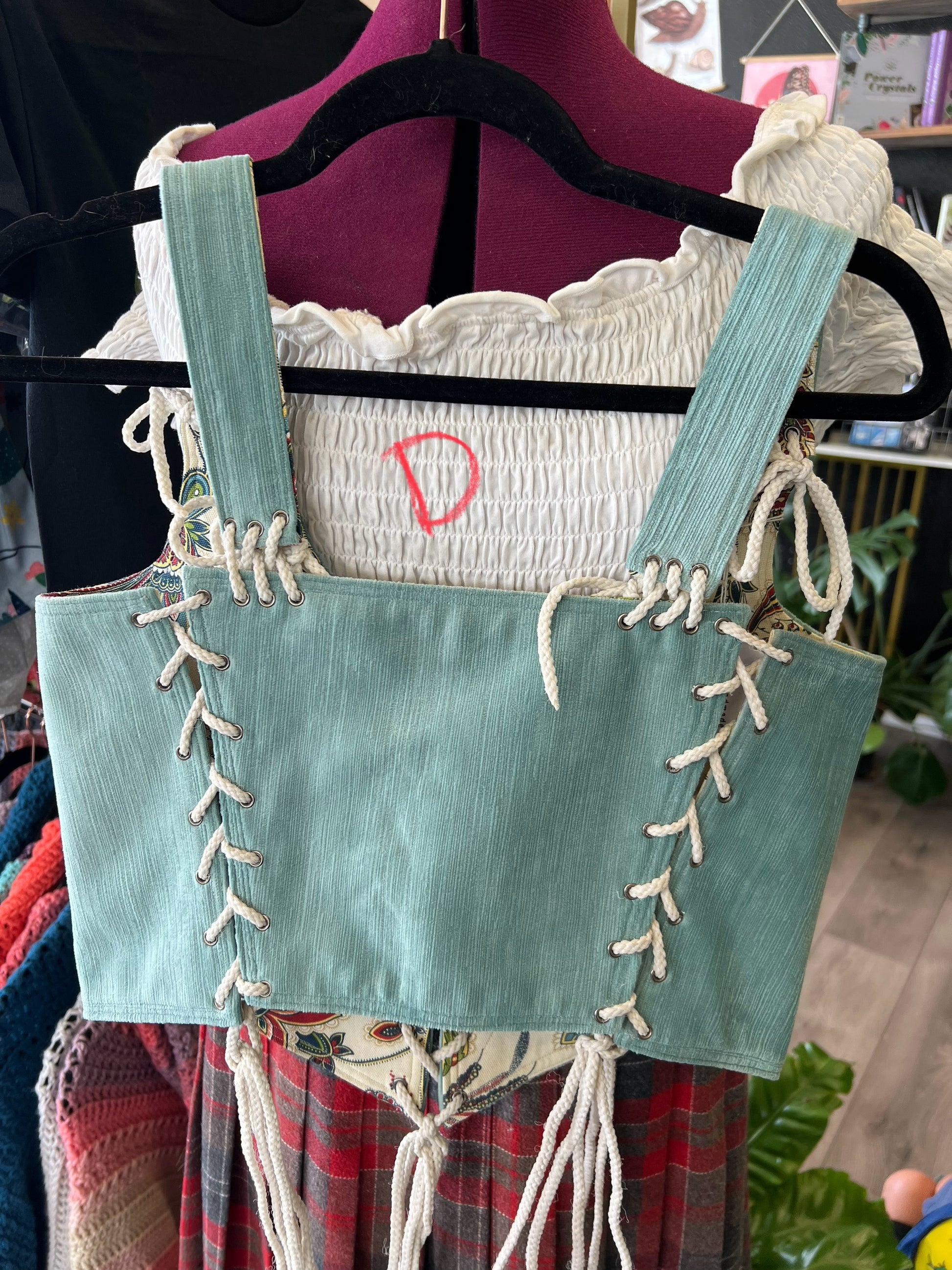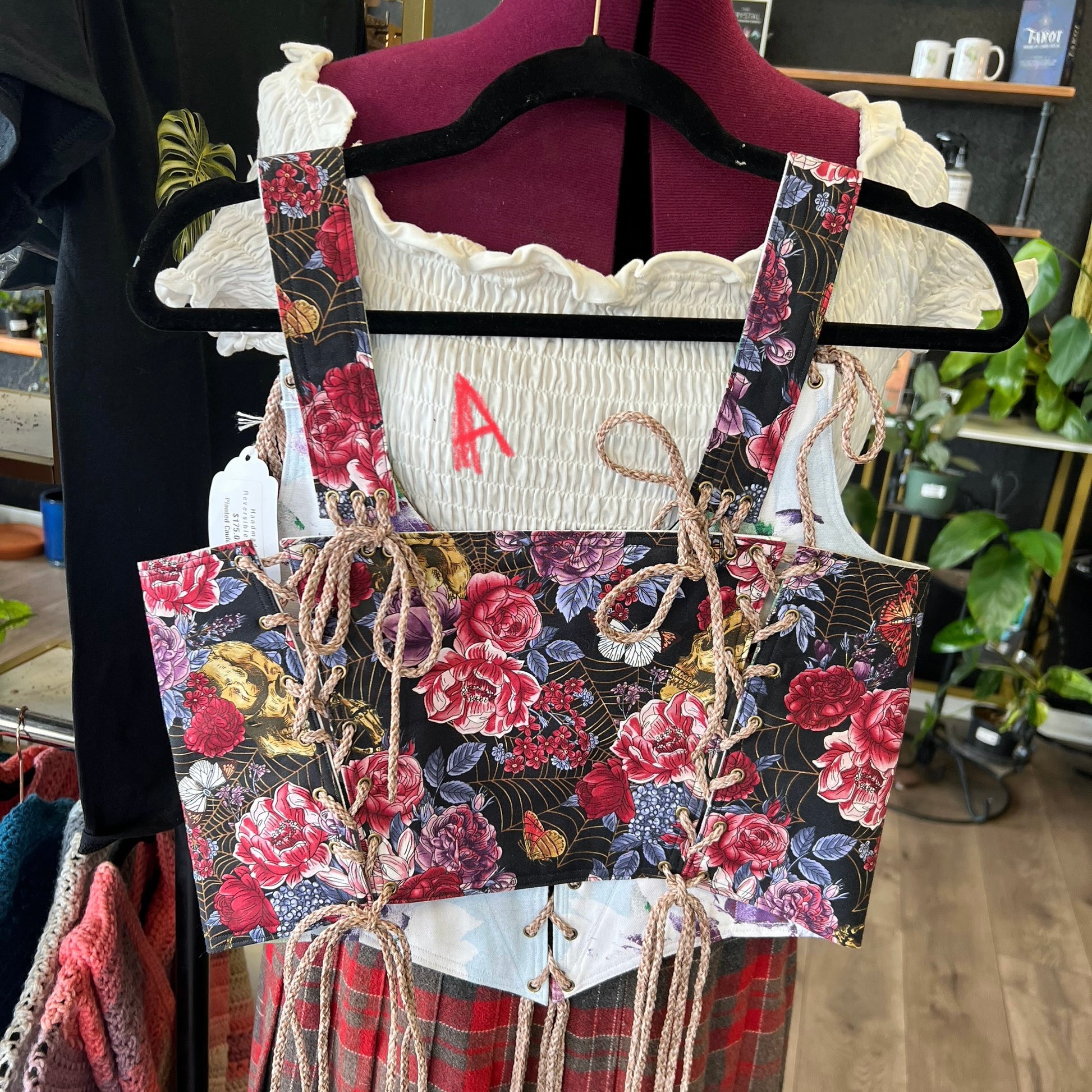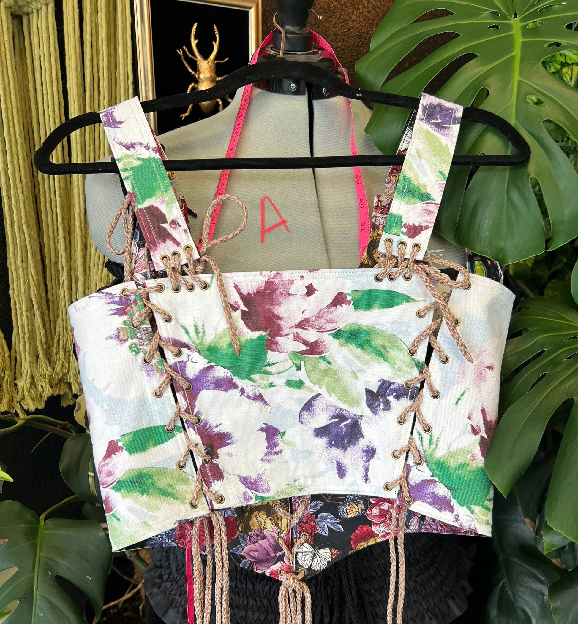 Each corset is reversible with a fantasy print on one side and a more rounded print on the other side.