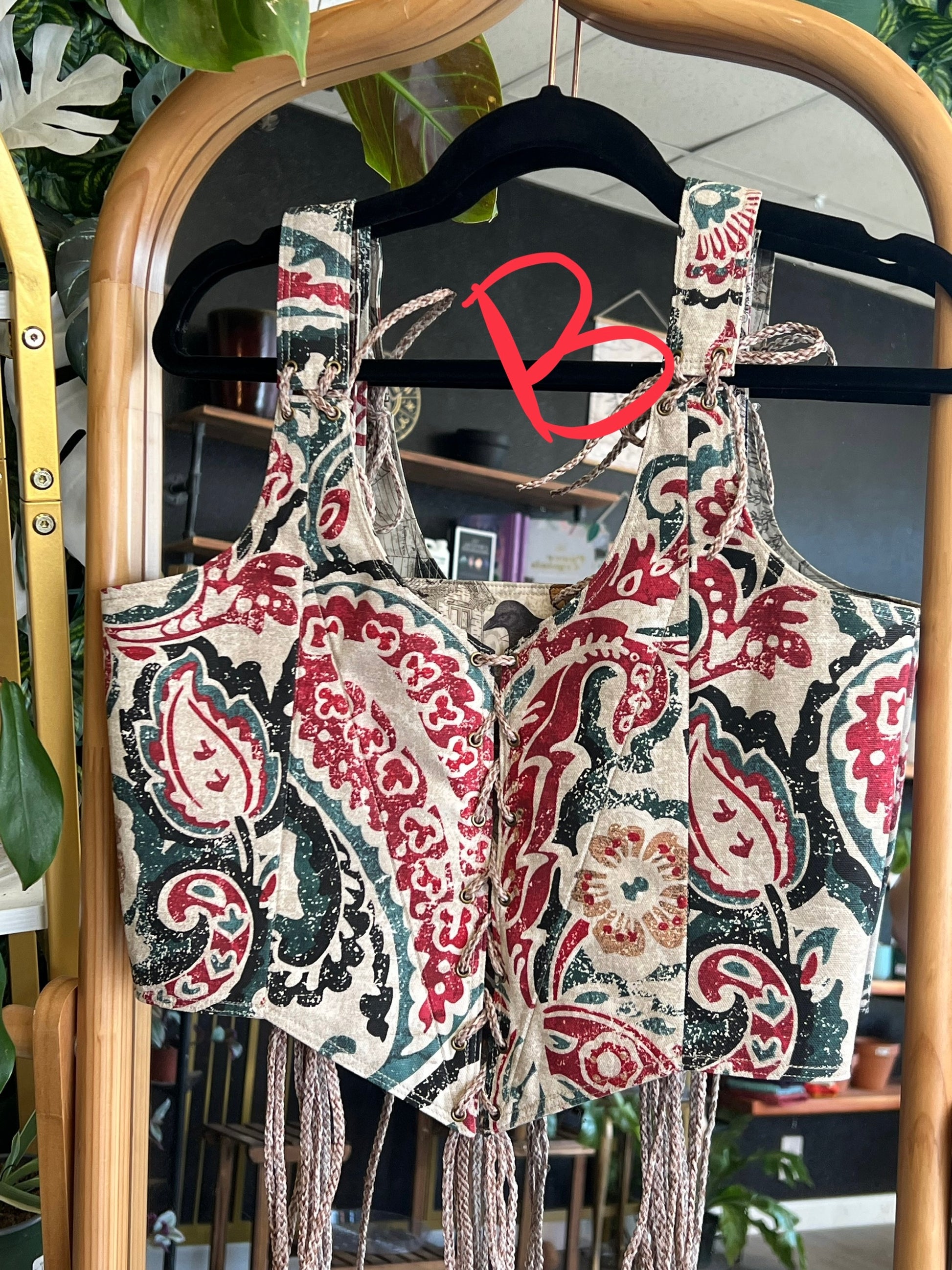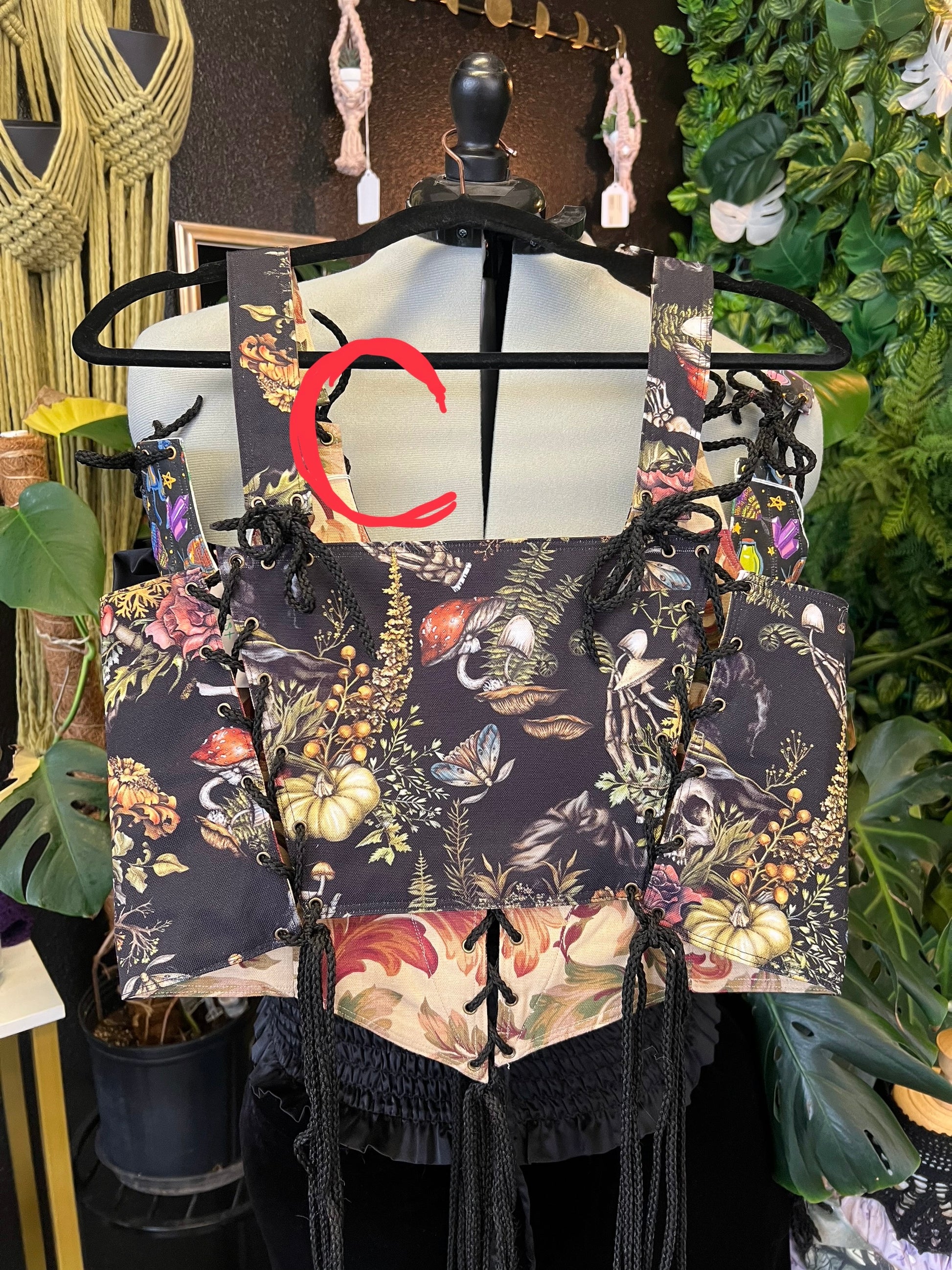Each corset is reversible with a fantasy print on one side and a more rounded print on the other side.